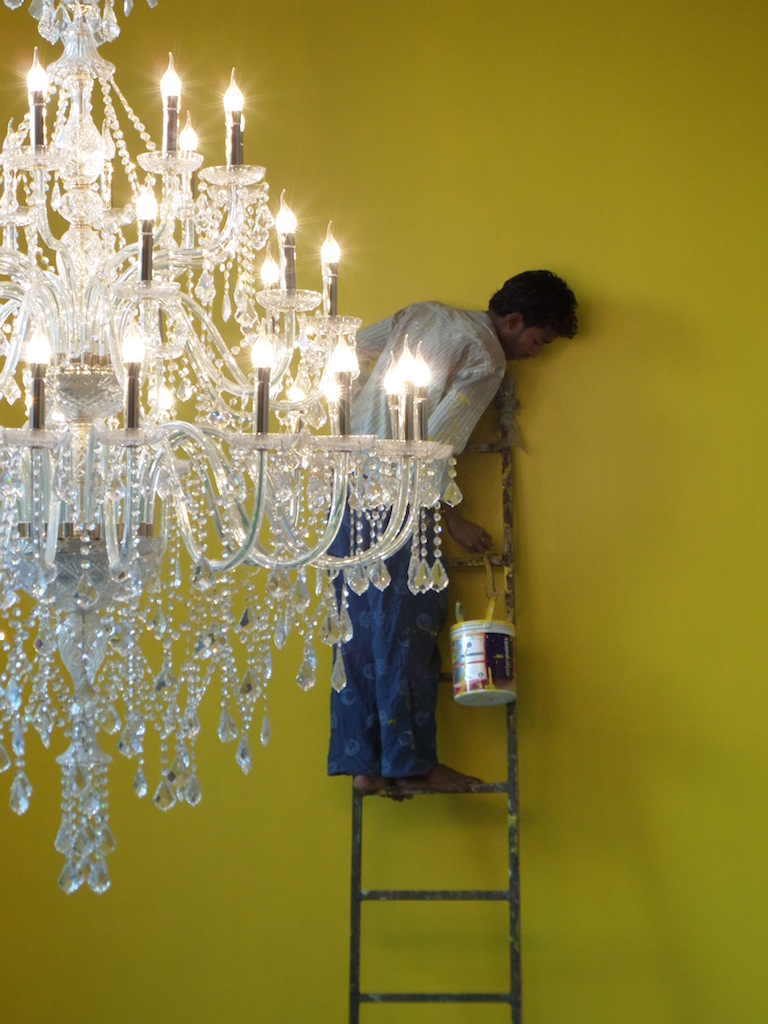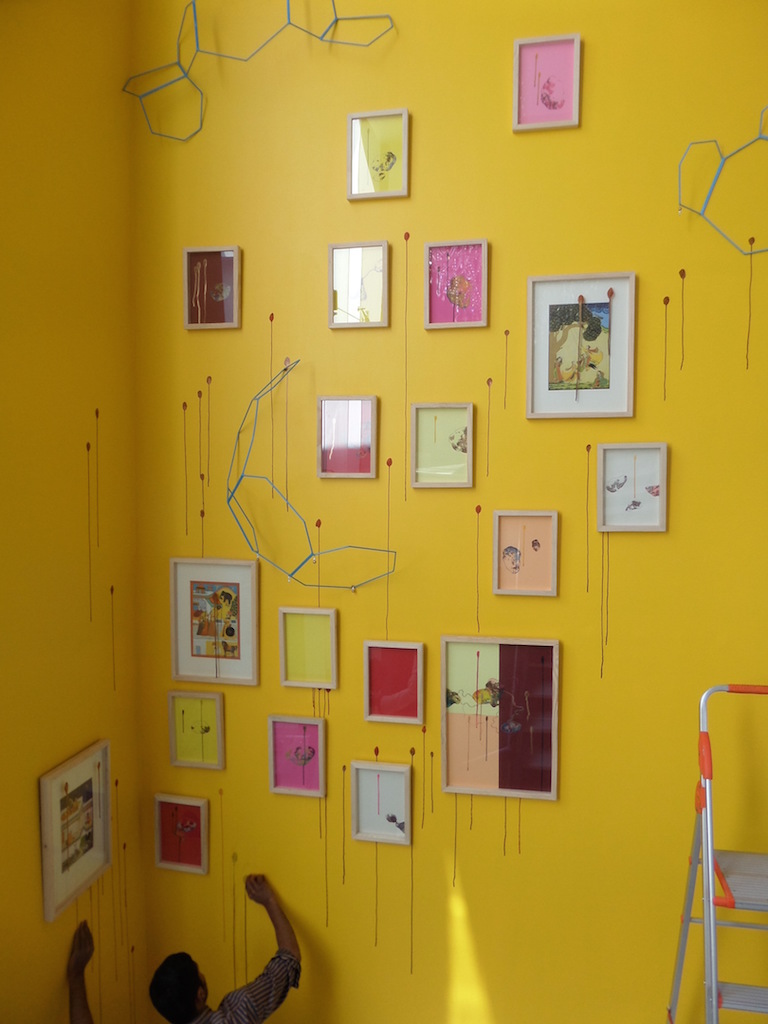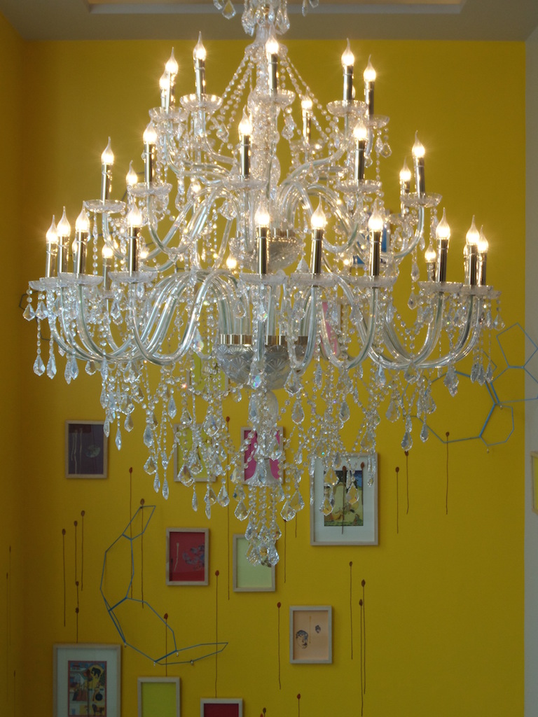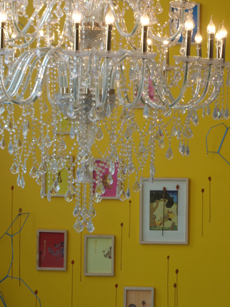 Painted wall, drawings, chandelier, varied dimensions