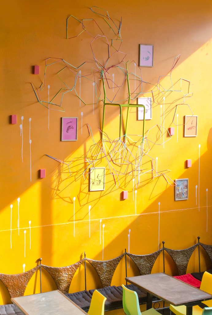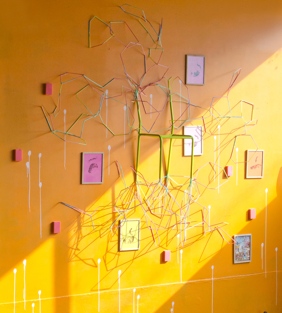 Mousse, métal, peinture, papier et paille alimentaire
