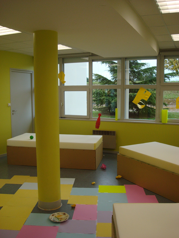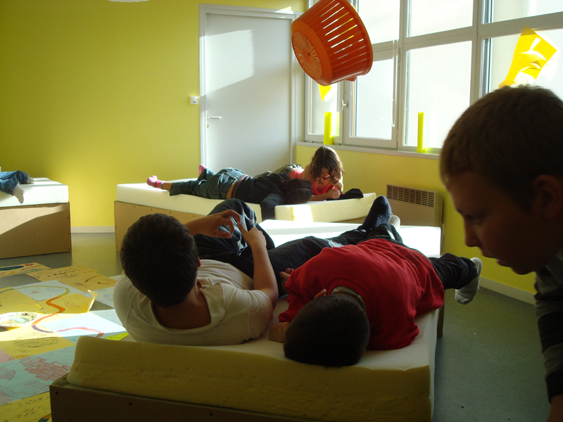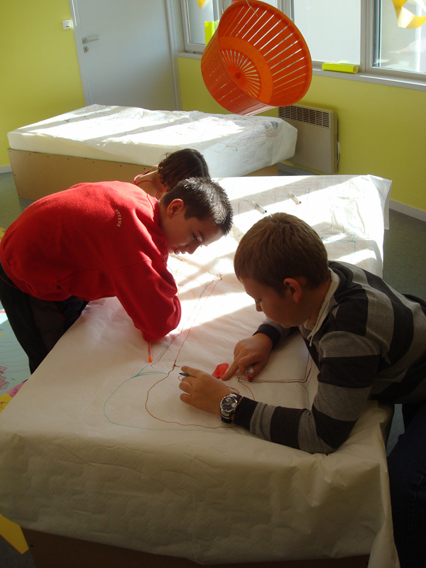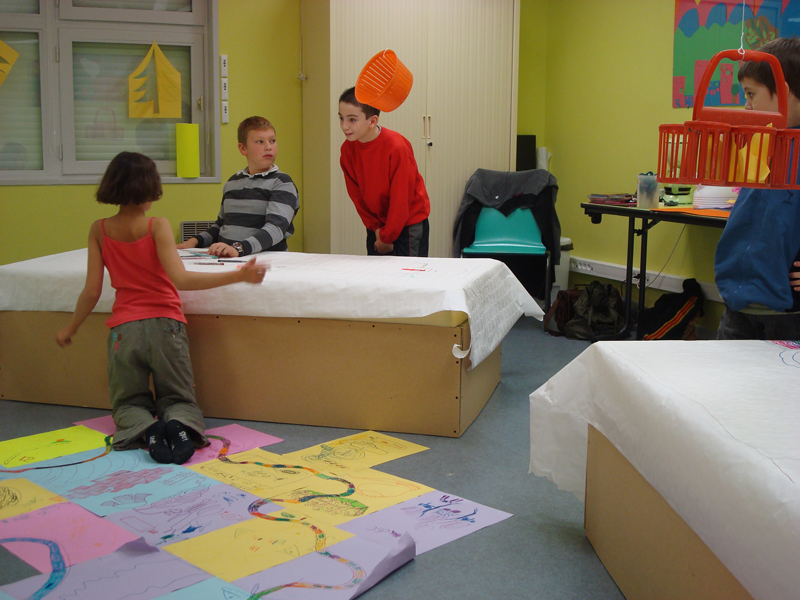 Installation éphémère réalisée à Pougues-Les-Eaux (Bourgogne – France) en 2008 avec les enfants du Centre de loisirs. Composition de plusieurs matelas mousse incrustée avec des objets familiers.