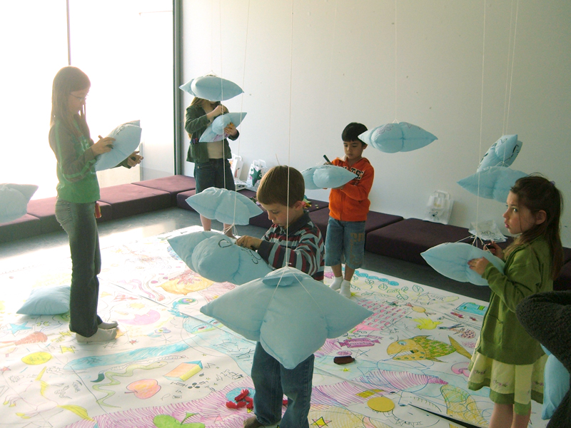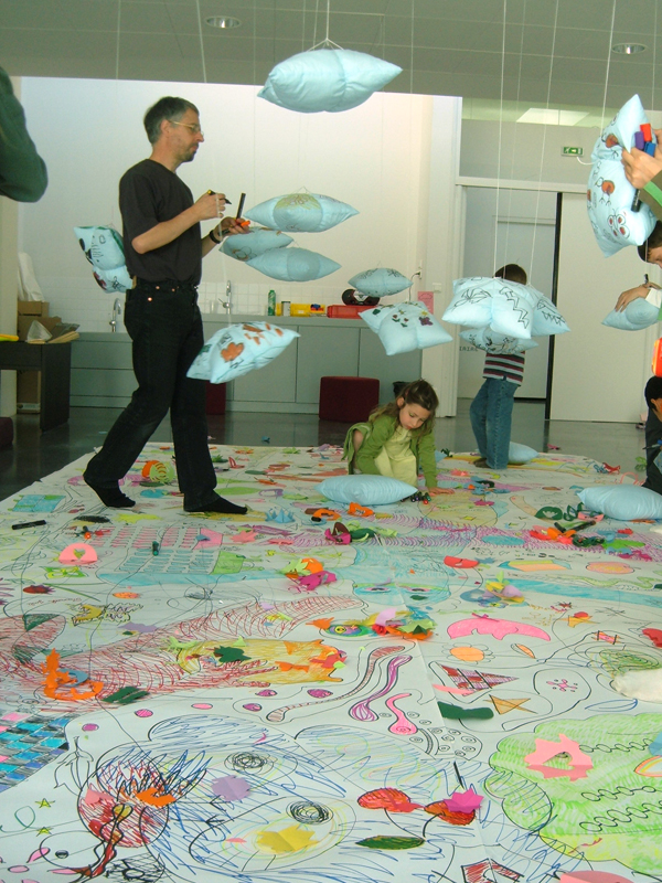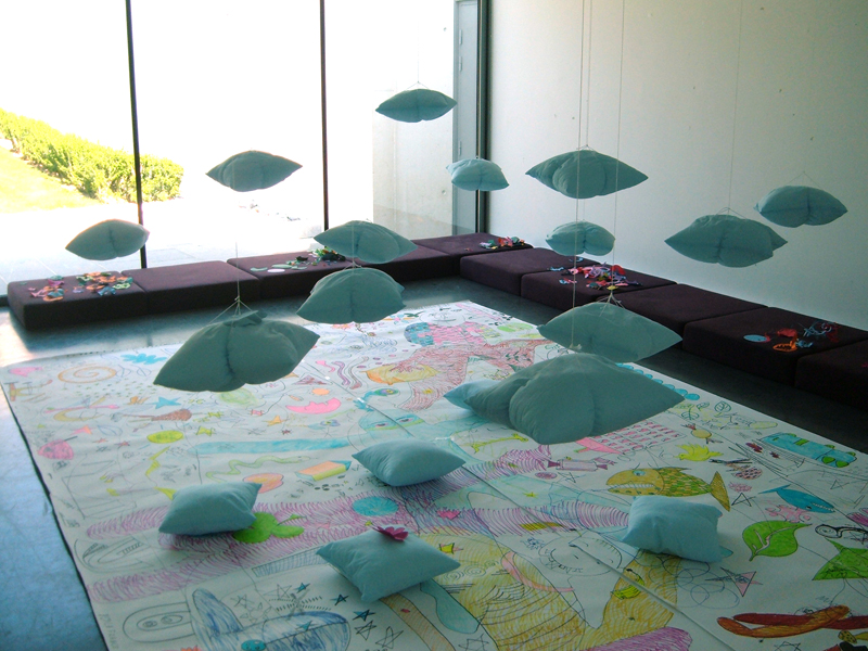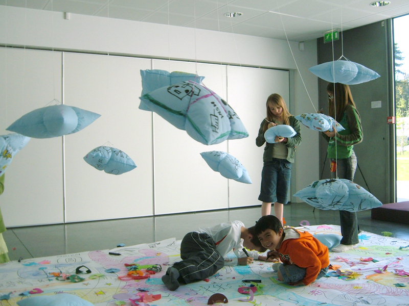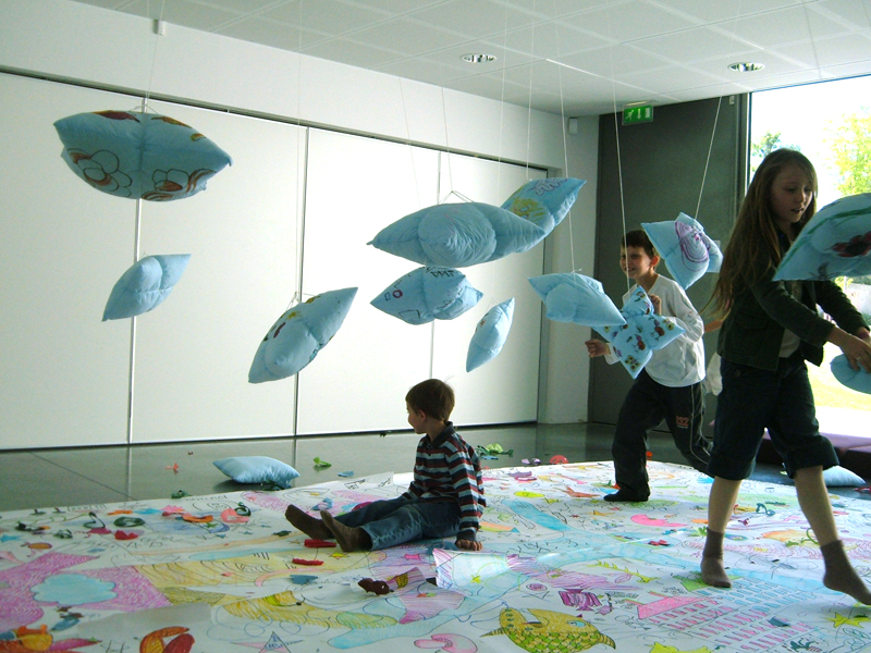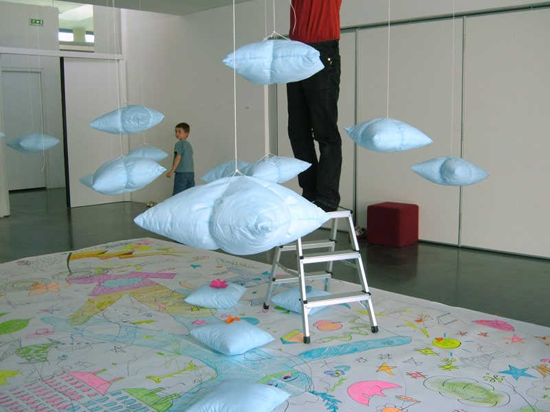 Œuvre réalisée au Musée d’art contemporain du Val de Marne (MACVAL) en 2009. Sculpture composée de cinquante coussins suspendus au plafond et décorés par les jeunes adultes du centre de loisirs.