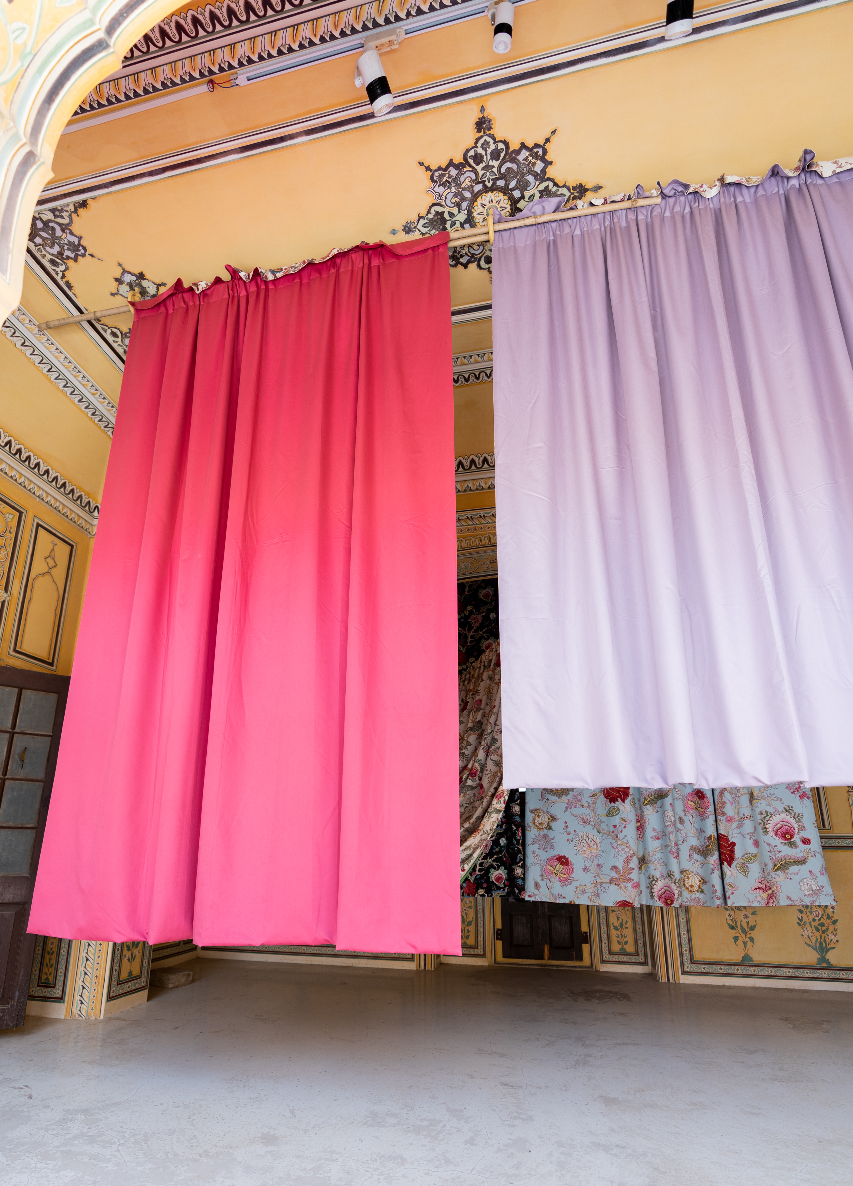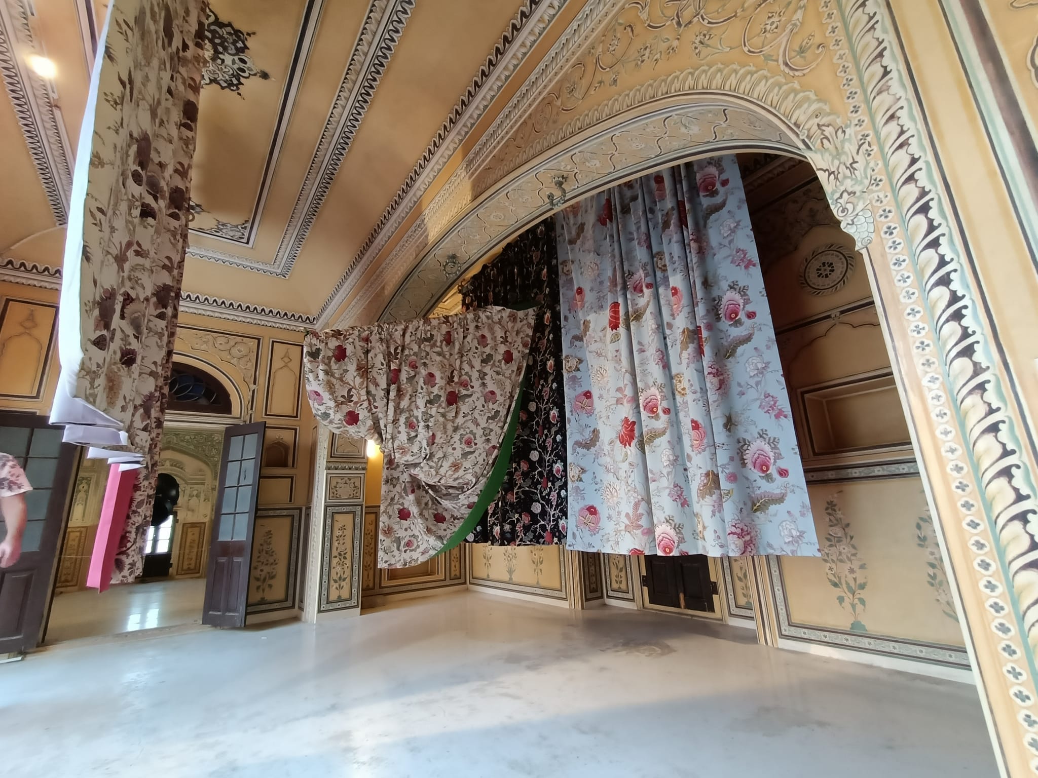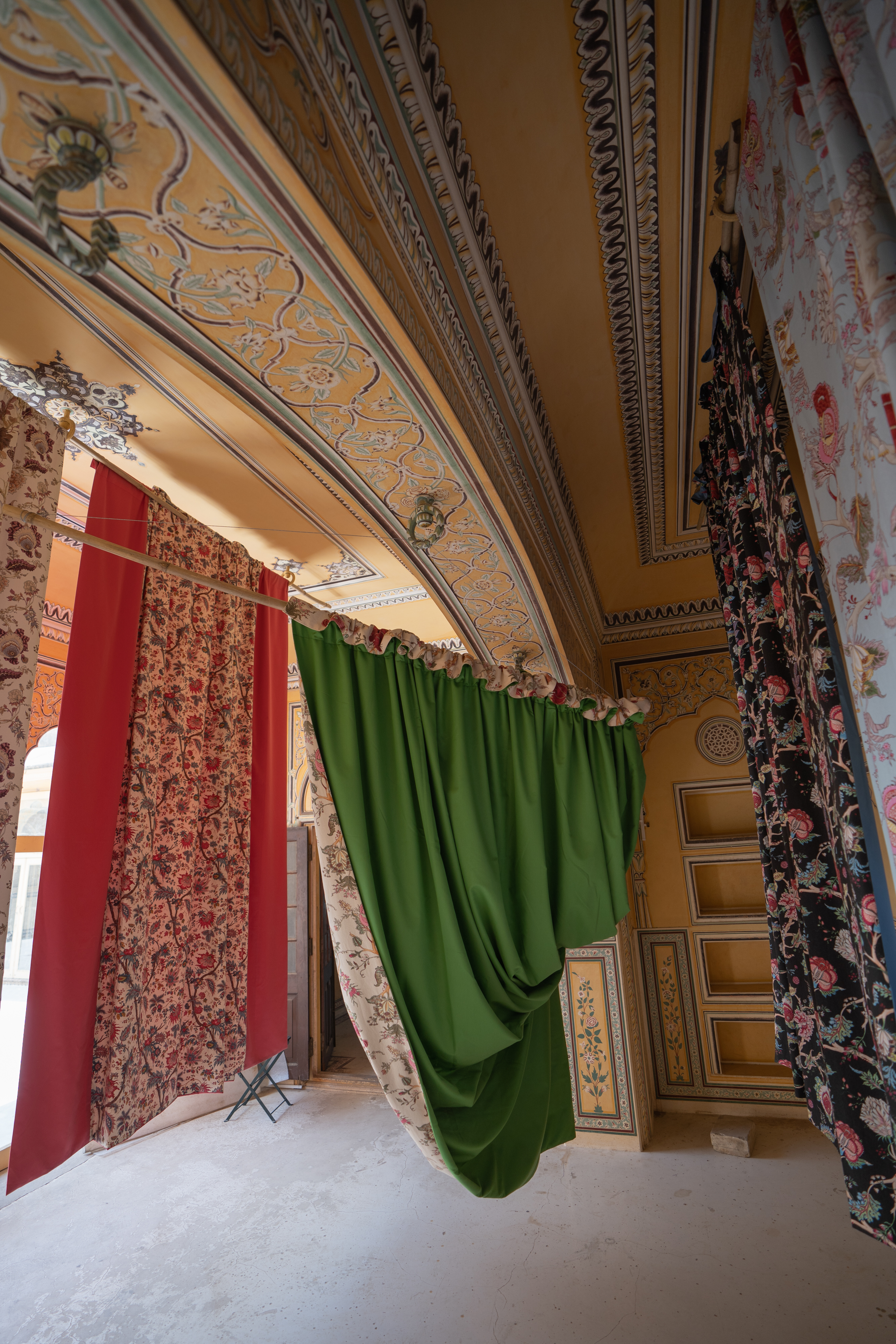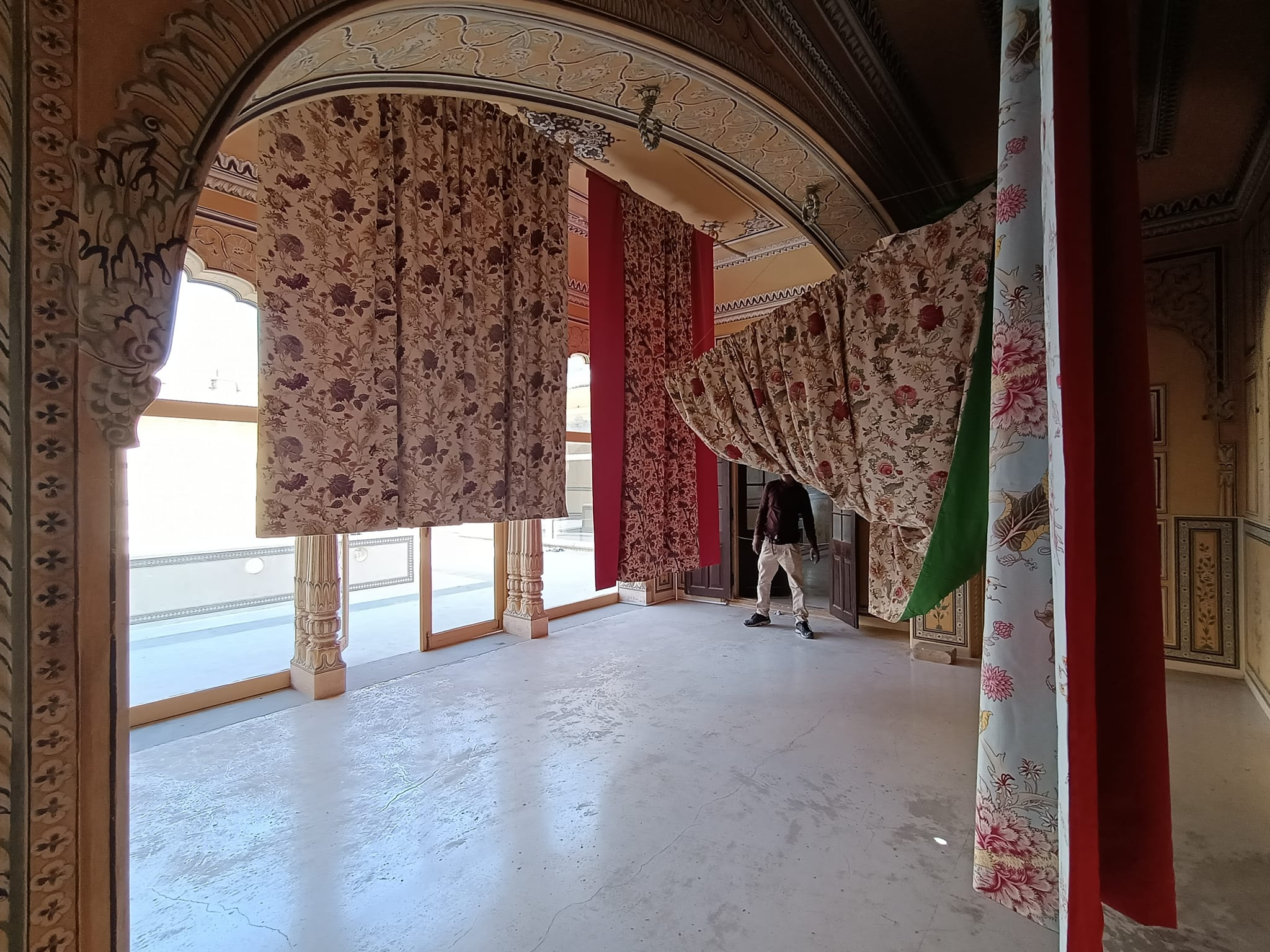 Nine artists (Anastasio, Fonteles, Khosla, Kumar, Mocelin & Pellegrini, Noureldin, Pasolini, Xavier) created new site-specific works inspired by and responding to the architecture of the palace and the context of Jaipur. The remaining five artists chose works to display within the elaborately decorated spaces of the palace to bring new perspectives to their creations, which were most usually displayed in the white box spaces of museums and art galleries.