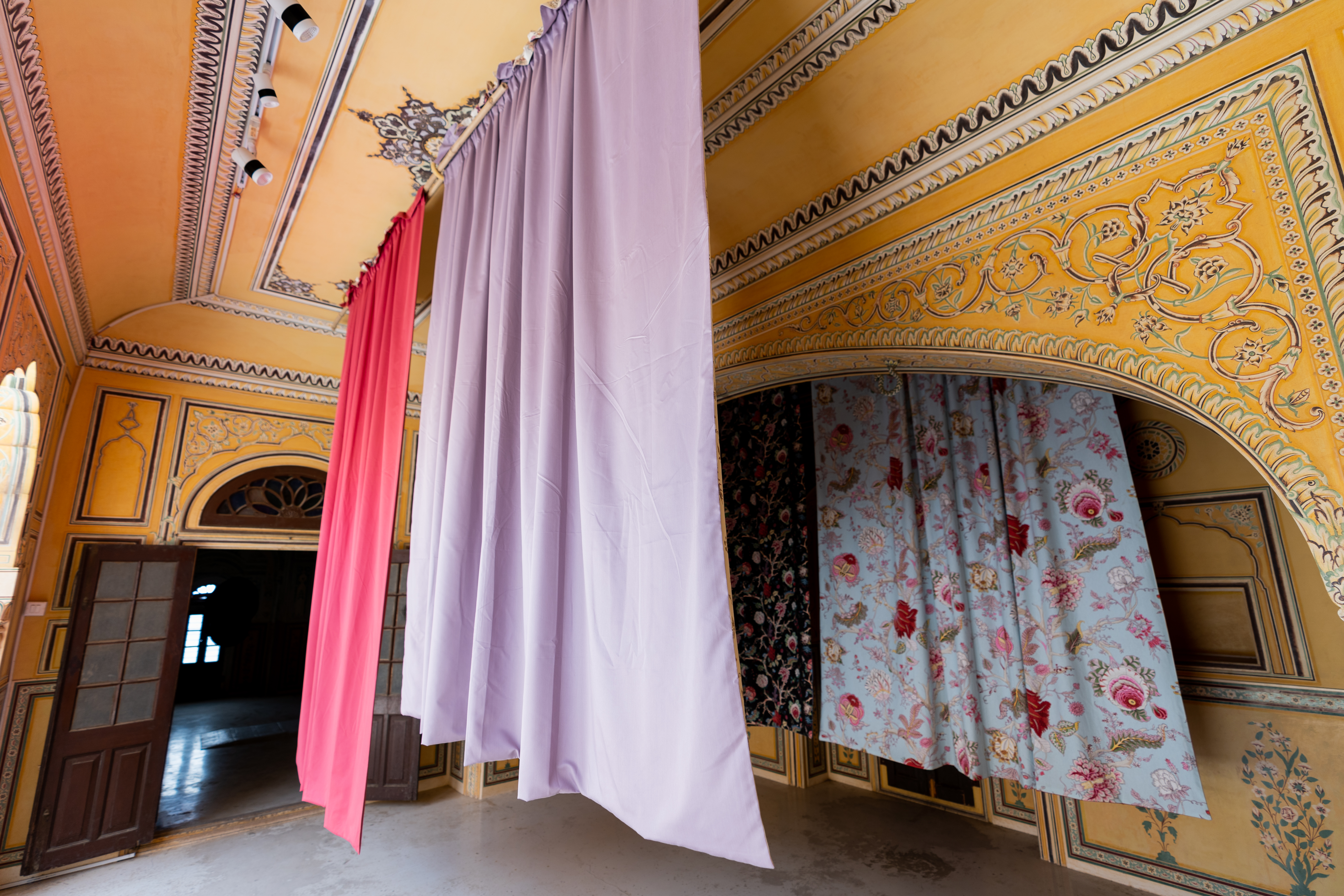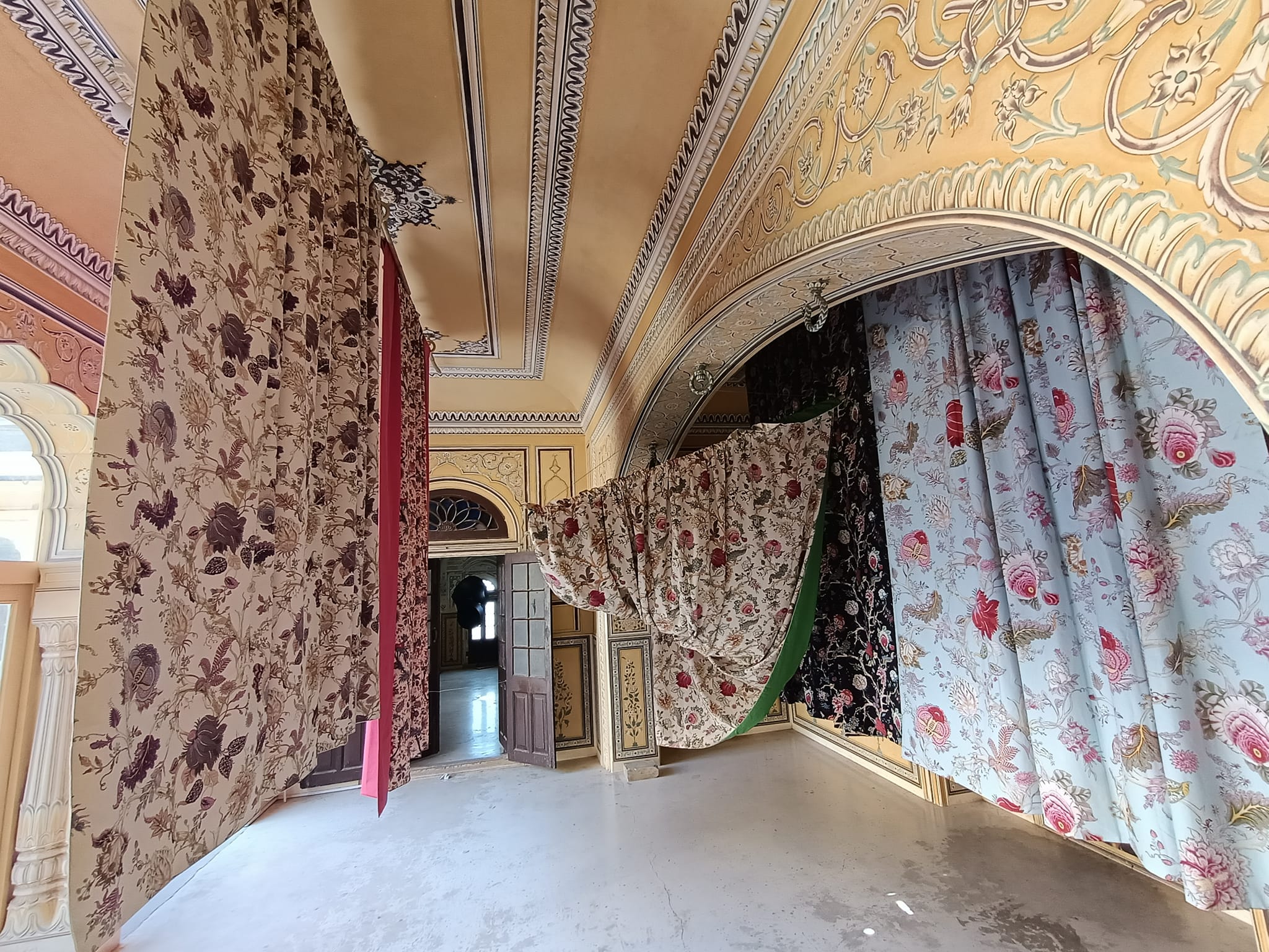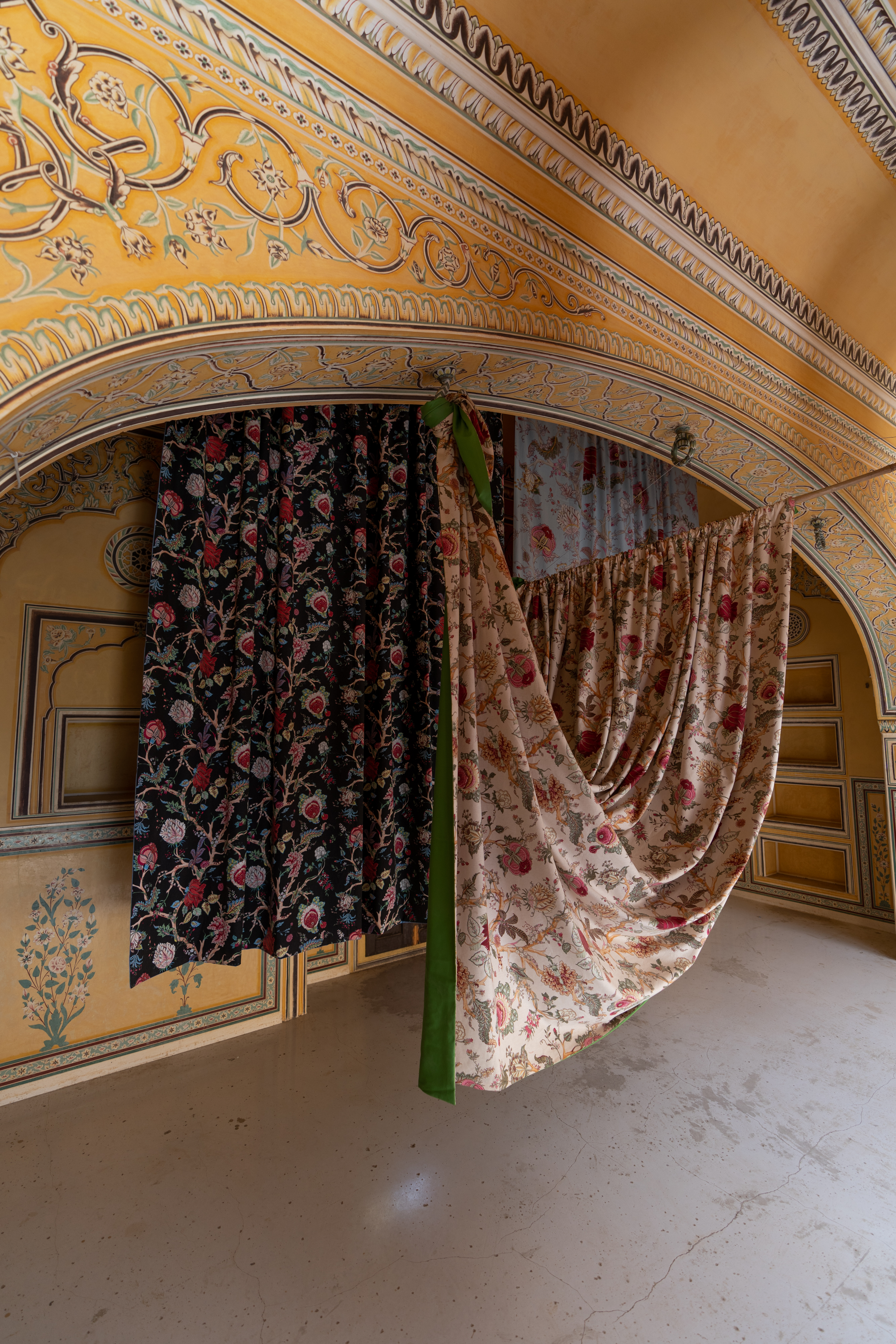 Nine artists (Anastasio, Fonteles, Khosla, Kumar, Mocelin & Pellegrini, Noureldin, Pasolini, Xavier) created new site-specific works inspired by and responding to the architecture of the palace and the context of Jaipur. The remaining five artists chose works to display within the elaborately decorated spaces of the palace to bring new perspectives to their creations, which were most usually displayed in the white box spaces of museums and art galleries.