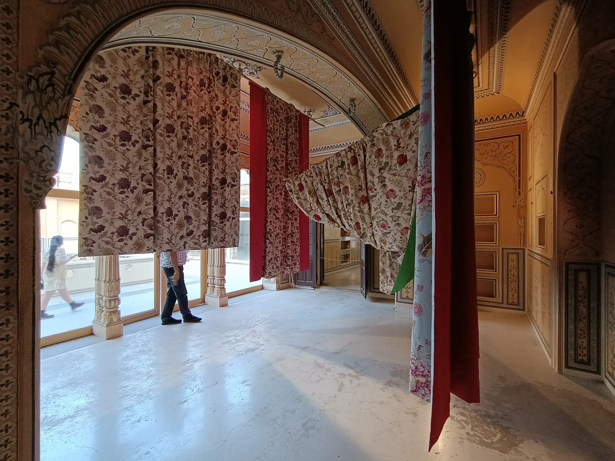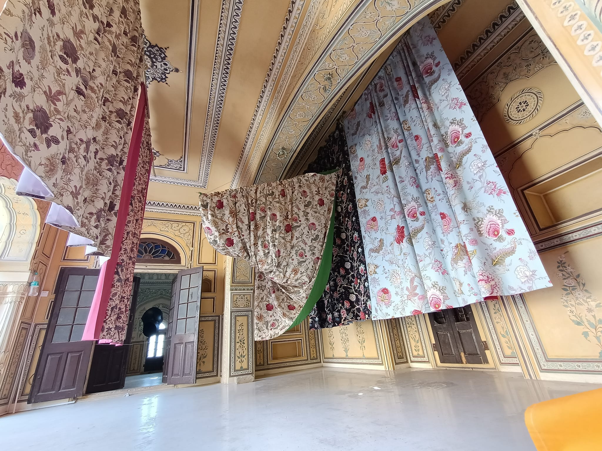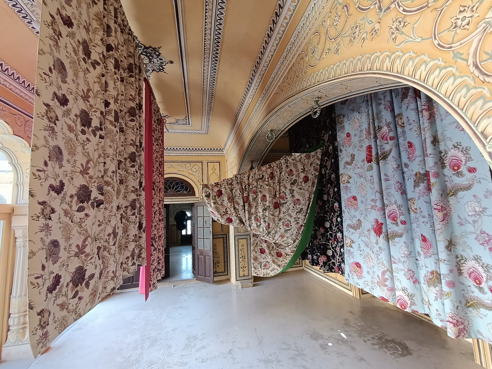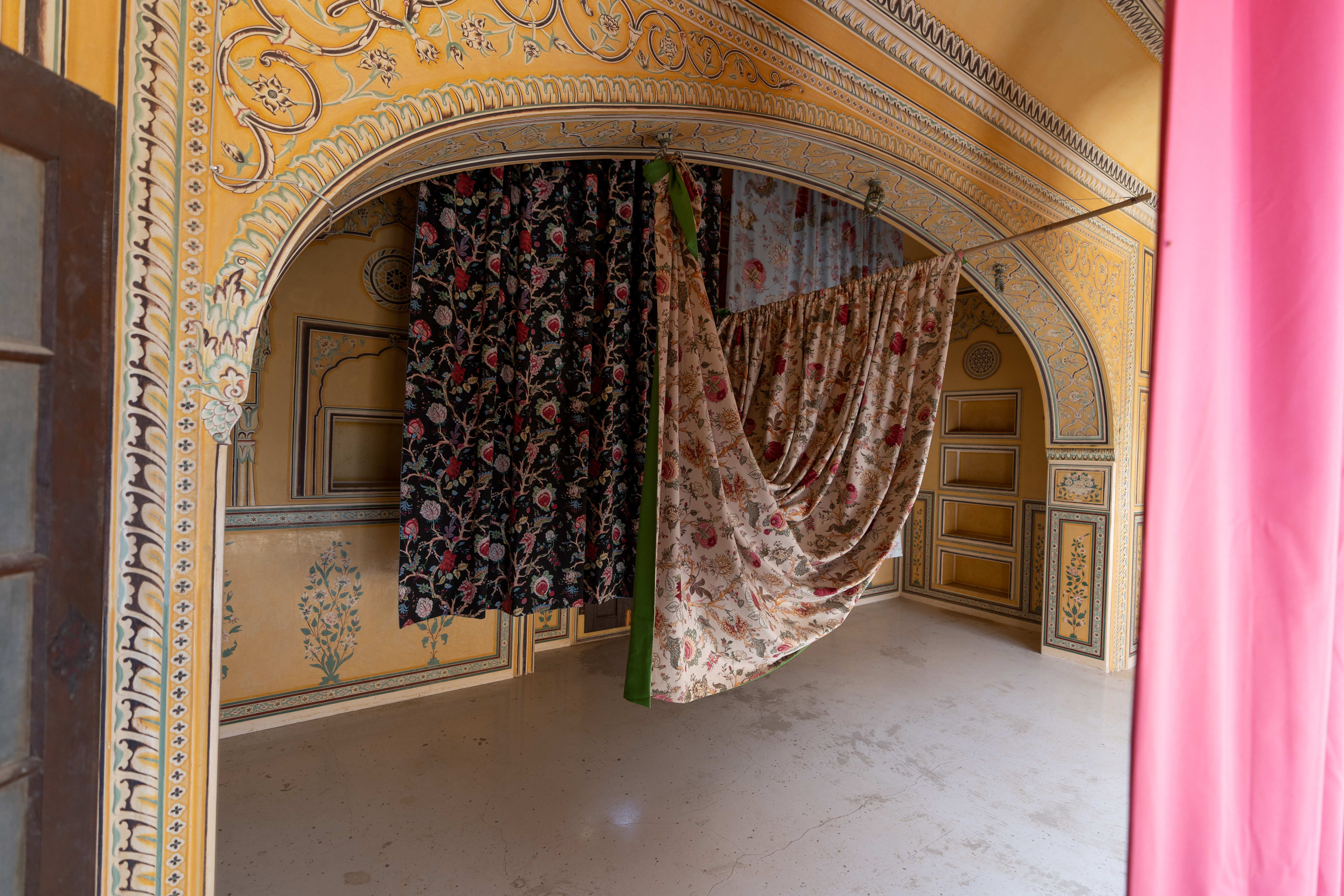 Nine artists (Anastasio, Fonteles, Khosla, Kumar, Mocelin & Pellegrini, Noureldin, Pasolini, Xavier) created new site-specific works inspired by and responding to the architecture of the palace and the context of Jaipur. The remaining five artists chose works to display within the elaborately decorated spaces of the palace to bring new perspectives to their creations, which were most usually displayed in the white box spaces of museums and art galleries.